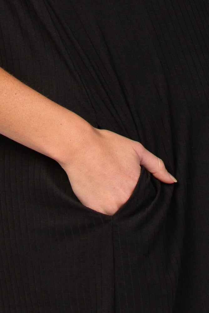 A ribbed maternity midi dress featuring short cuffed sleeves, a curved hem, side pockets and a rounded neckline.