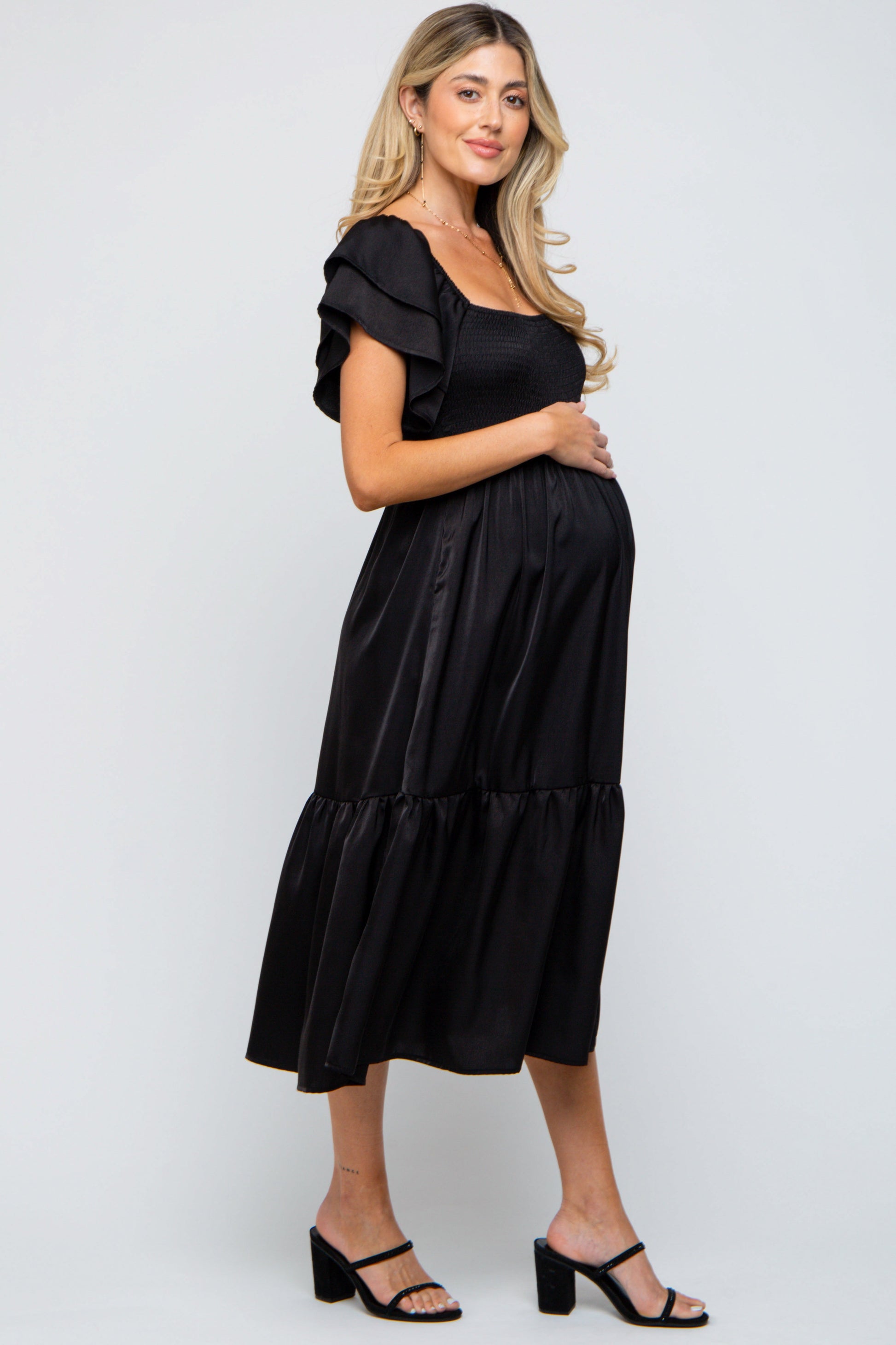 A solid satin maternity midi dress featuring short flutter sleeves, a smocked top, side pockets, a ruffle hem and a square neckline.
