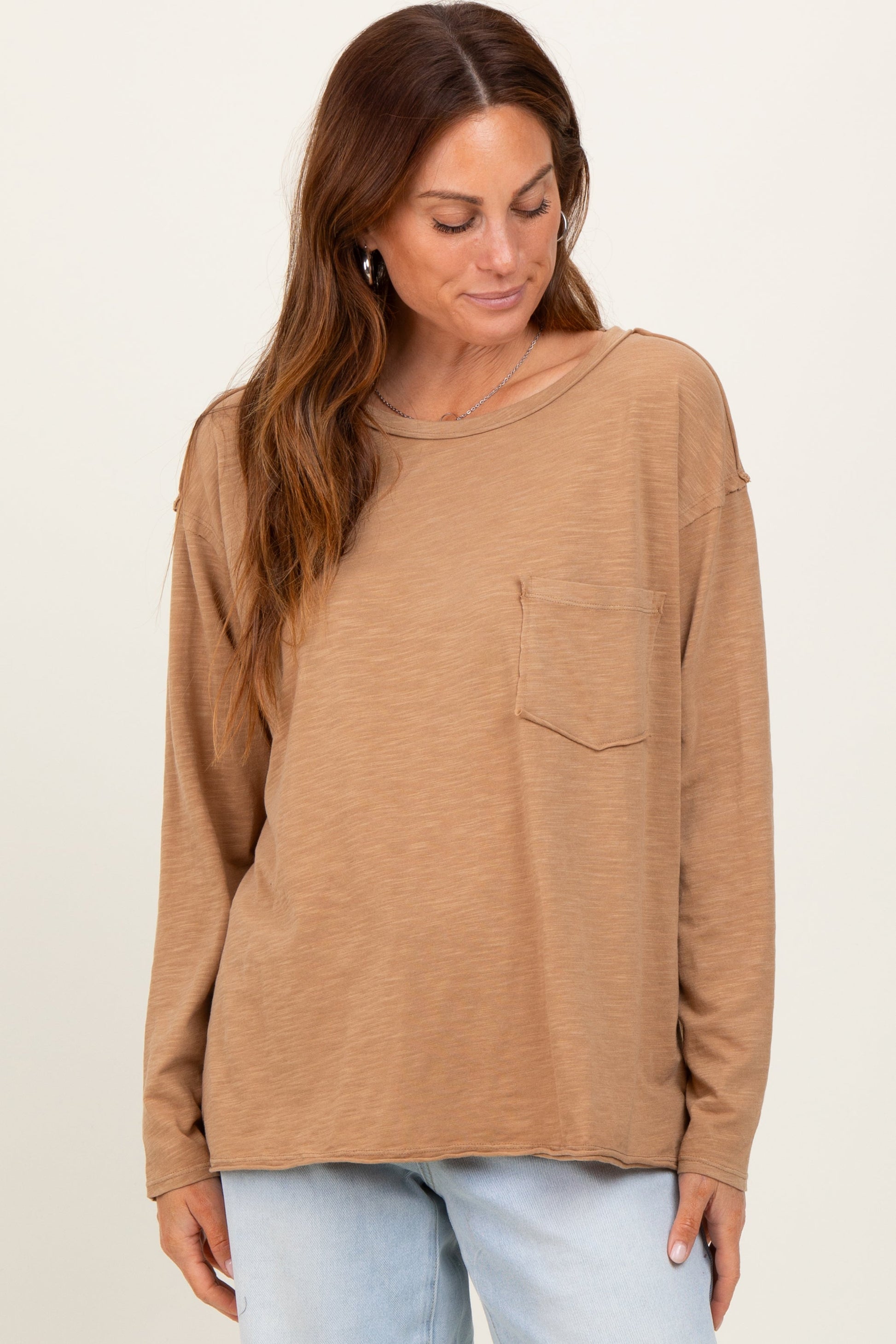 Camel Mineral Wash Front Pocket Long Sleeve Maternity Top