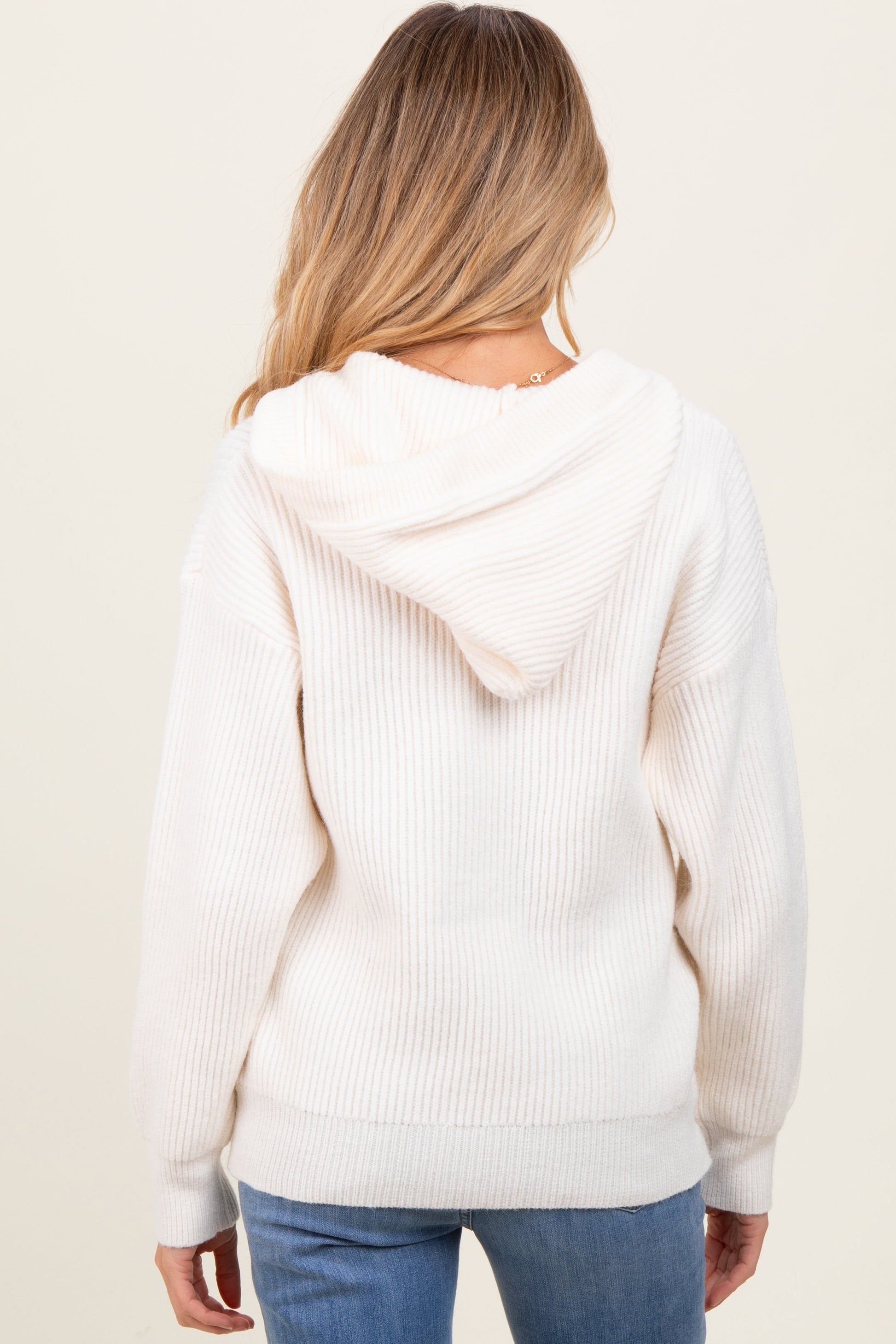 Cream Ribbed Knit Button Front Hooded Maternity Sweater