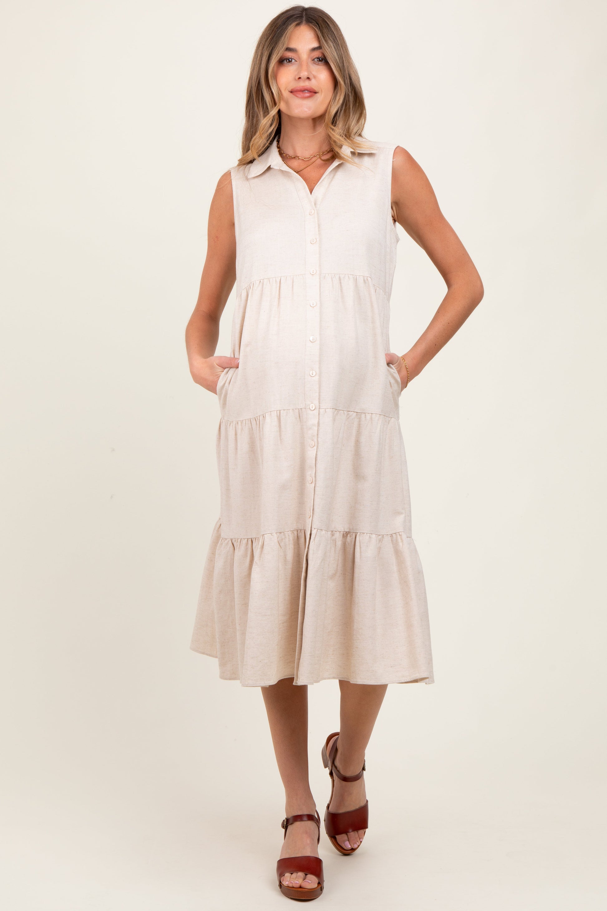 Cream Tiered Sleeveless Maternity Midi Shirt Dress