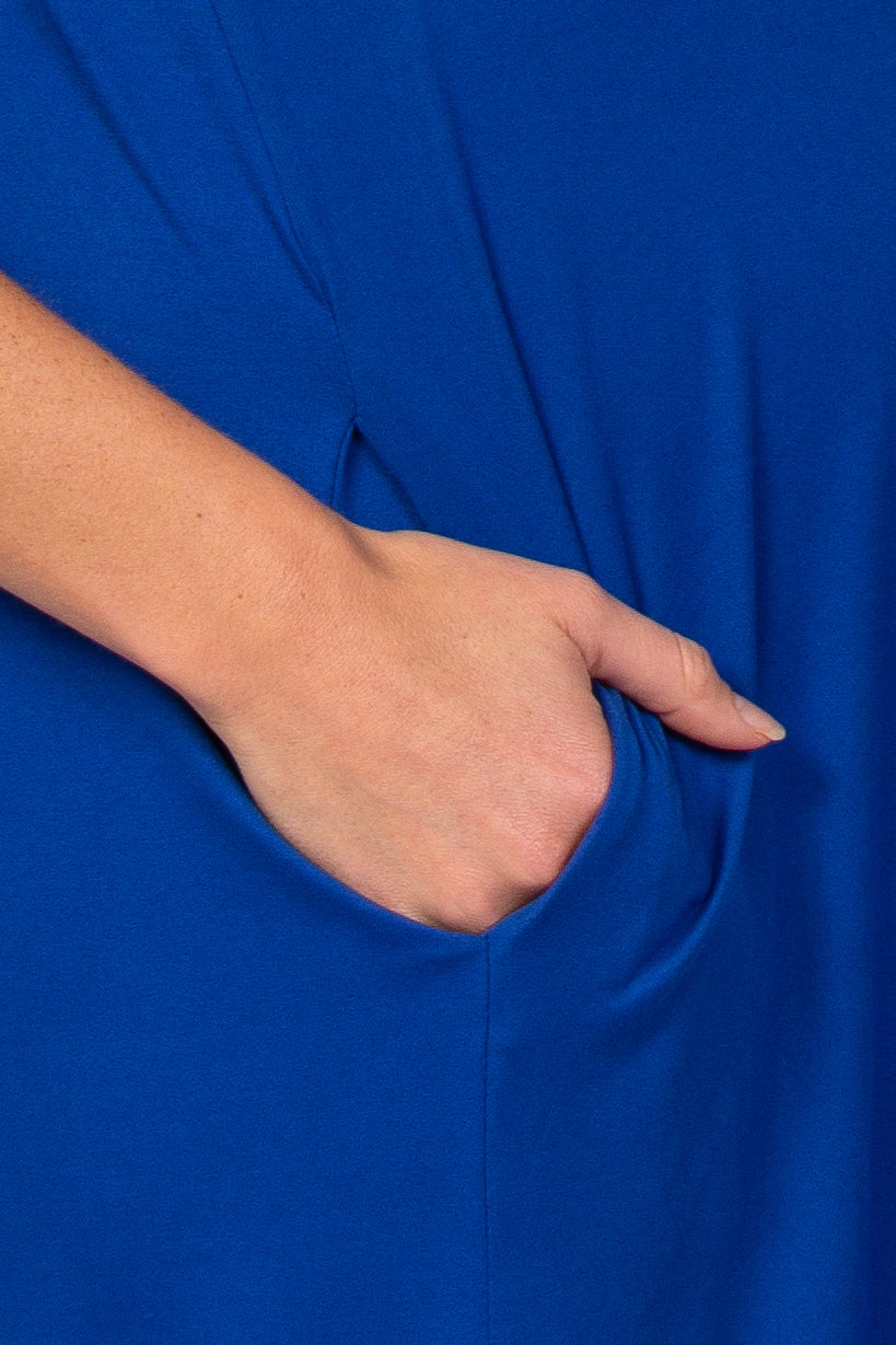 A solid hued maternity dress featuring short sleeves, a round neckline, side pockets, a curved hem and large side slits.